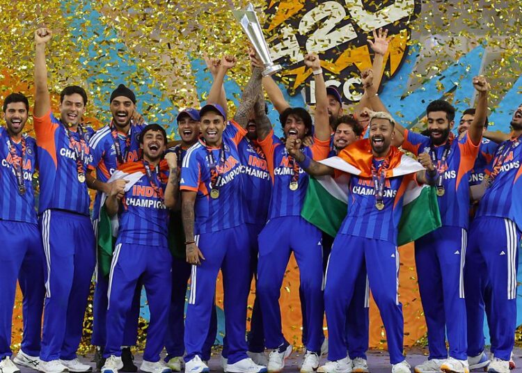 Picture: Suryakumar Yadav Captain of India together with the teammates lifts the trophy after profitable the ICC Males’s T20 World Cup India & Sri Lanka 2026 Last between India and New Zealand at Narendra Modi Stadium on March 8, 2026 in Ahmedabad, India. (Credit score: MB Media/Getty Pictures)